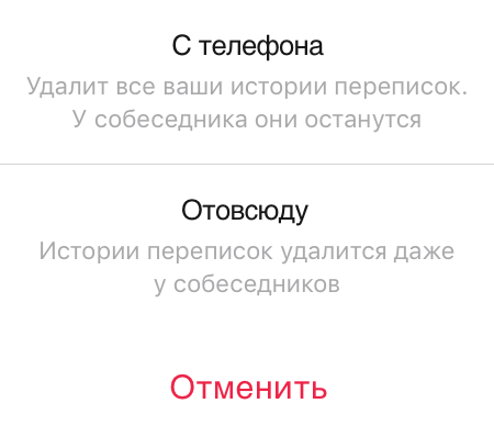 Если возникла опасность, что переписку прочтут, то есть возможность удалить всю переписку по чату или сразу по всем. Чтобы удалить переписку у собеседника, ему пересылается специальное сообщение, которое удалит ему всю переписку.