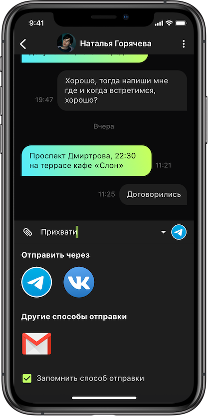 Чтобы подчеркнуть секретность чатов, мы сделали их тёмного цвета. Так как вся секретная переписка важна, мы особо выделили сообщения собеседника.
