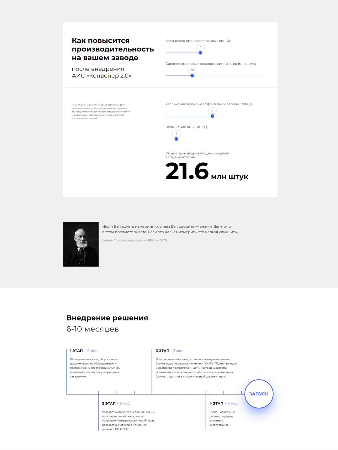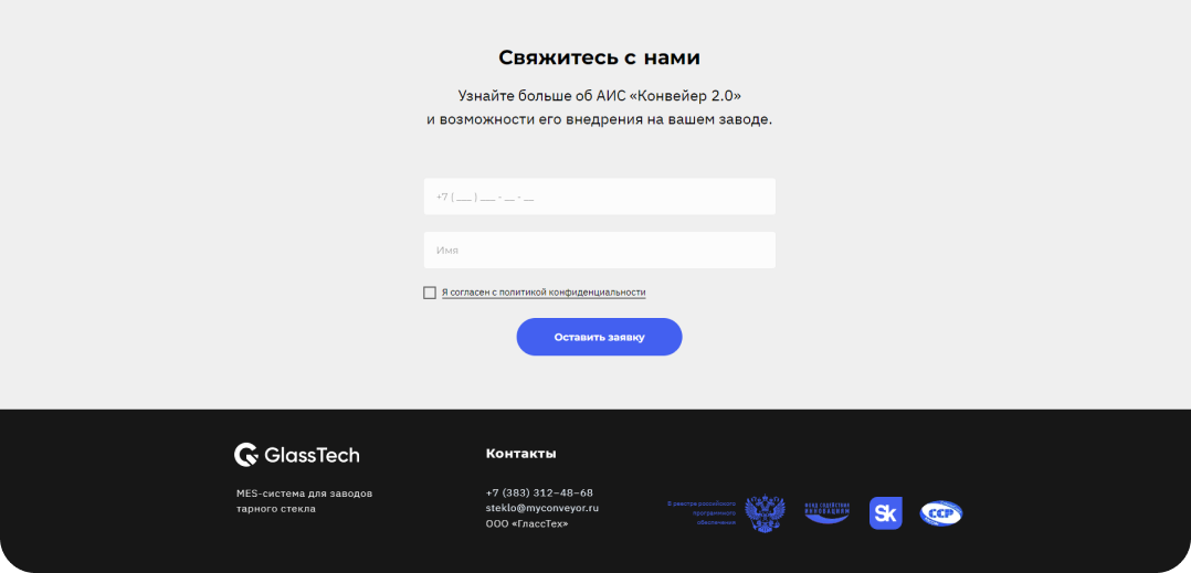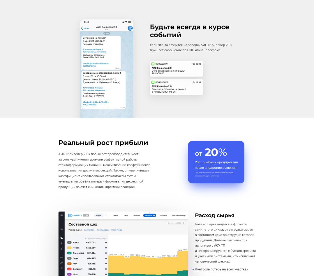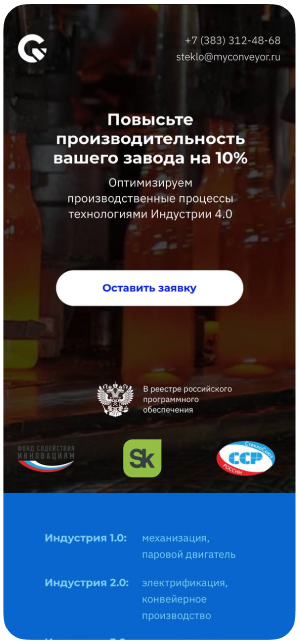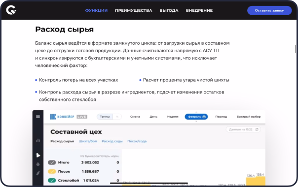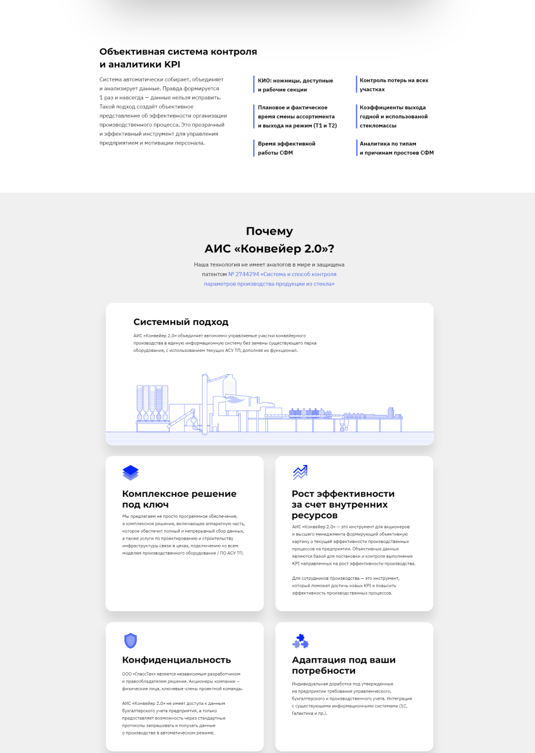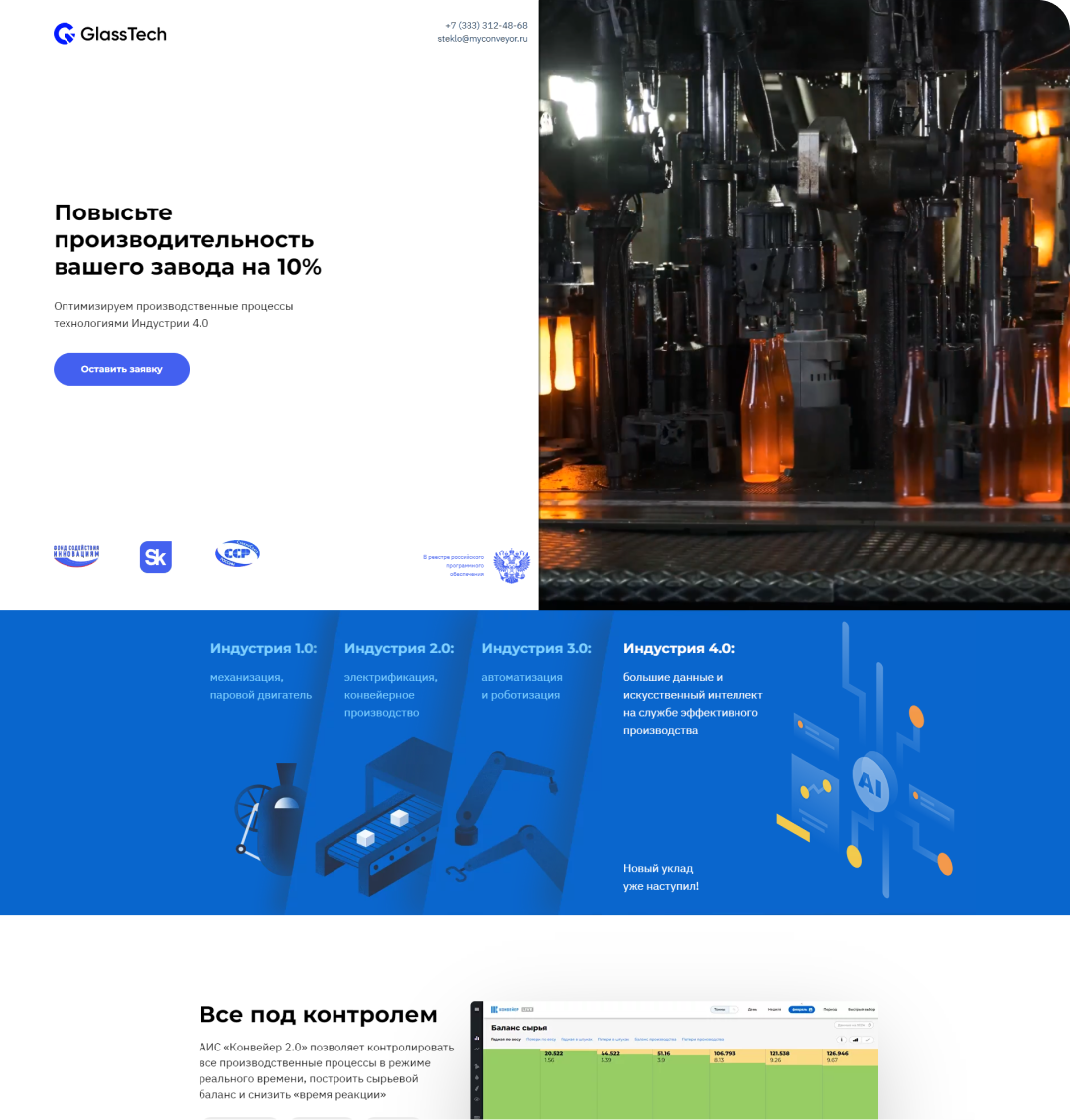 Glasstech специализируется на цифровизации производственных процессов стекольных заводов. Компания собирает данные с программного обеспечения различных систем управления производством, настраивает сервера и визуализирует производственные процессы на собственном ПО. Они заказали сайт для тёплых и холодных продаж. До этого они продавали своё решение только через личную презентацию.
